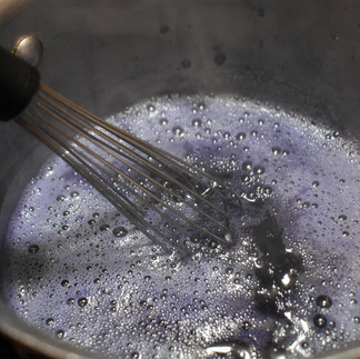 In a small saucepan, pour your water and whisk in the sugar and blue butterfly pea flower powder till dissolved. Sprinkle the gelatin over the top and let sit for at least 5 minutes. Not all of the gelatin will absorb the liquid beneath; that's okay.